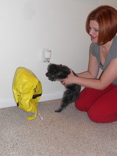 She was scared at first. But she slowly reached out and poked that creepy balloon in the mouth. Face to face. Mano a mano. Errr. Paw.
